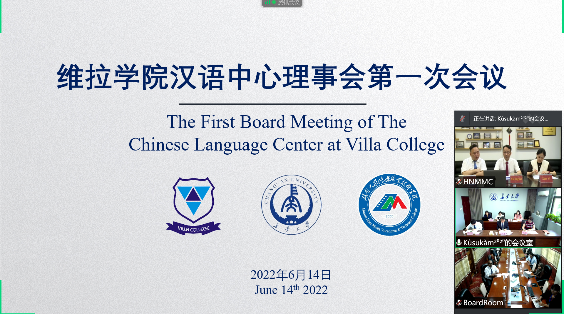 (国际交流处 李烜 供稿)6月14日,马尔代夫维拉学院汉语中心理事会第一次会议(线上)召开。本次会议采用视频连线方式,在湖南大众传媒职业技术学院、长安大学、马尔代夫维拉学院的会场同时举行。我院副院长谢景伟,国际交流处处长王涛以及来自长安大学、维拉学院的理事会成员参会。会议由长安大学国际教育学院院长张伟主持。