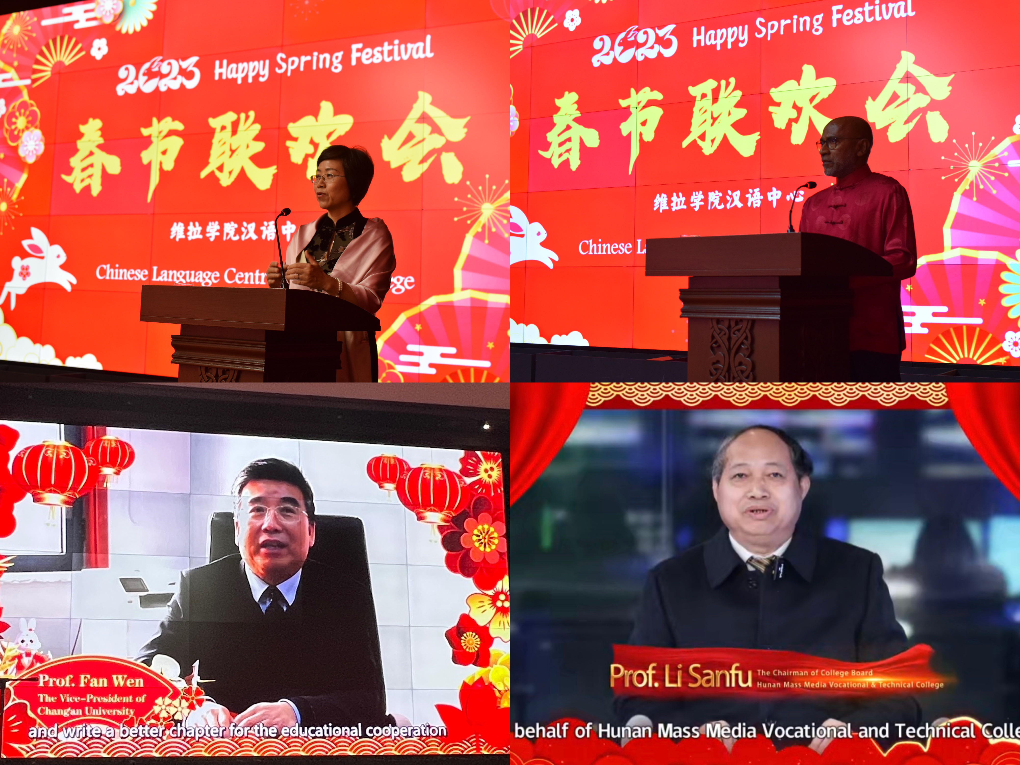 中国驻马尔代夫特命全权大使王立新、马尔代夫外交部外交秘书拉蒂夫、中资企业代表、华侨代表、中马友好协会、维拉集团代表、维拉学院中高层、维拉国际中学代表及当地部分中学代表等百余人欢聚一堂,共贺新春。长安大学党委常委、副校长范文,湖南大众传媒职业技术学院党委书记李三福通过云端送上了新春祝福。