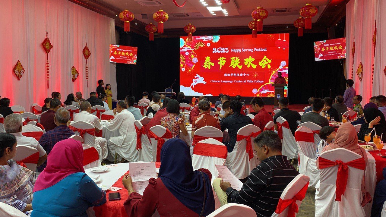 据悉,长安大学、湖南大众传媒职业技术学院于2020年3月获批与马尔代夫维拉学院合作建设马尔代夫维拉学院汉语中心。三方学校克服全球新冠疫情影响,通力协作,马尔代夫首家汉语中心(孔子学院)——维拉学院汉语中心于2022年9月28日正式揭牌启航。本次是马尔代夫维拉学院汉语中心揭牌成立后主办的首届春节联欢会,不仅为马尔代夫人民搭建了一个了解中国文化的平台,也为远在他乡的华人华侨送上了家的温暖。