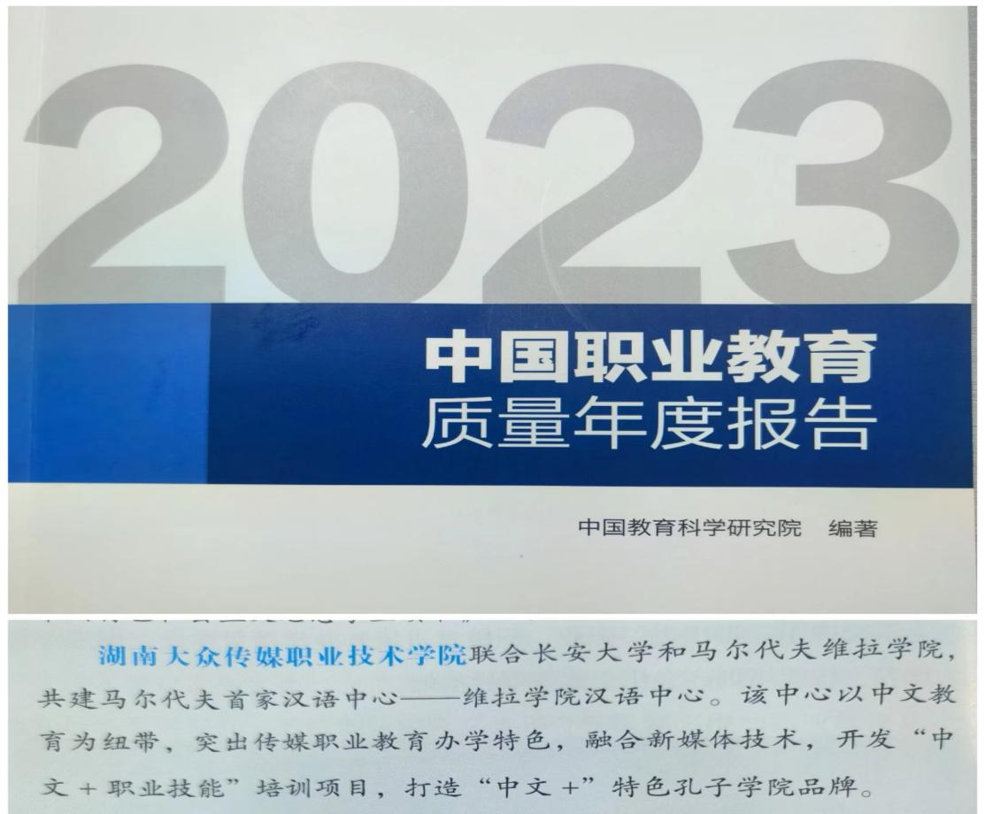 《质量年报》指出,“湖南大众传媒职业技术学院联合长安大学和马尔代夫维拉学院共建马尔代夫首家汉语中心——维拉学院汉语中心。该中心以中文教育为纽带,突出传媒职业教育办学特色,融合新媒体技术,开发‘中文+职业技能’培训项目,打造‘中文+’特色孔子学院品牌。”